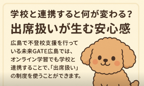 広島で不登校支援を探す方へ。未来GATE広島は学校と連携し、オンライン学習でも出席扱いの可能性を広げるフリースクールです。小学生・中学生の安心できる学びをサポートします。